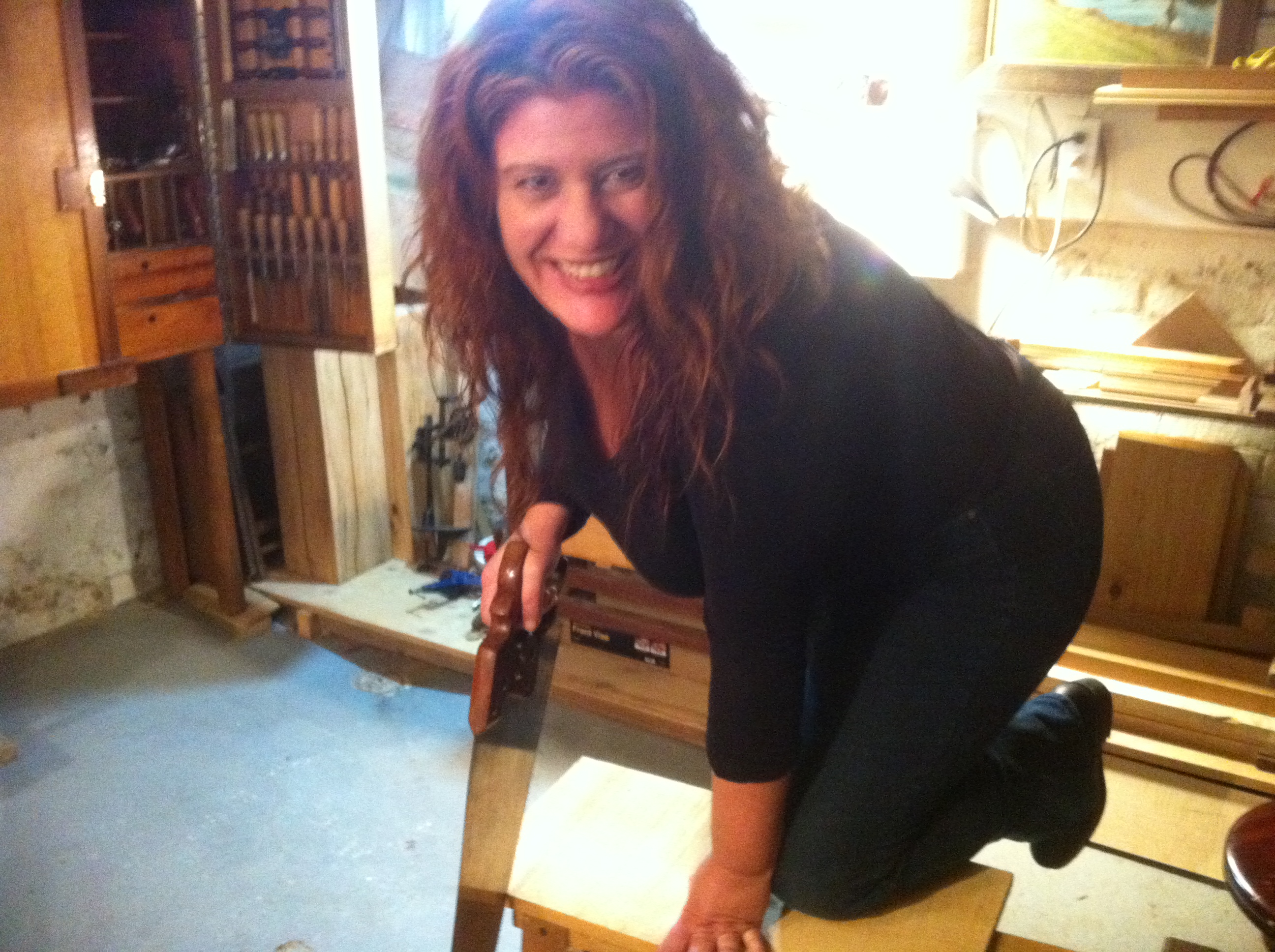 Once again, fortune smiled on us and we found a great teacher named Tom Fidgen. Originally from Cape Breton, Tom is a hand-tool specialist and gives lessons in his studio here in Toronto. Having never taught women before, I can imagine the impression the two of us made at ten in the morning with lip-gloss and hoop earrings and a pink hammer. At the time, the pink hammer was the only tool in my possession which I bought at a breast cancer fundraiser (because I was tired of ruining my shoes trying to hang pictures.) Tom, despite initial nervousness and faced with two tall, glossed up women beaming with pride about some sort of useless pink tool – was a patient, engaging, humorous and excellent teacher who made the lessons really fun! When he was first attempting to describe a wood plane, we both inspected the tool in front of us and exclaimed in unison – Wow! it works just like a foot plane at the spa! Basically, woodworking is giving a piece of wood a pedicure. You even use varnish! Ha! See, woodworking summed up in less than ten words.