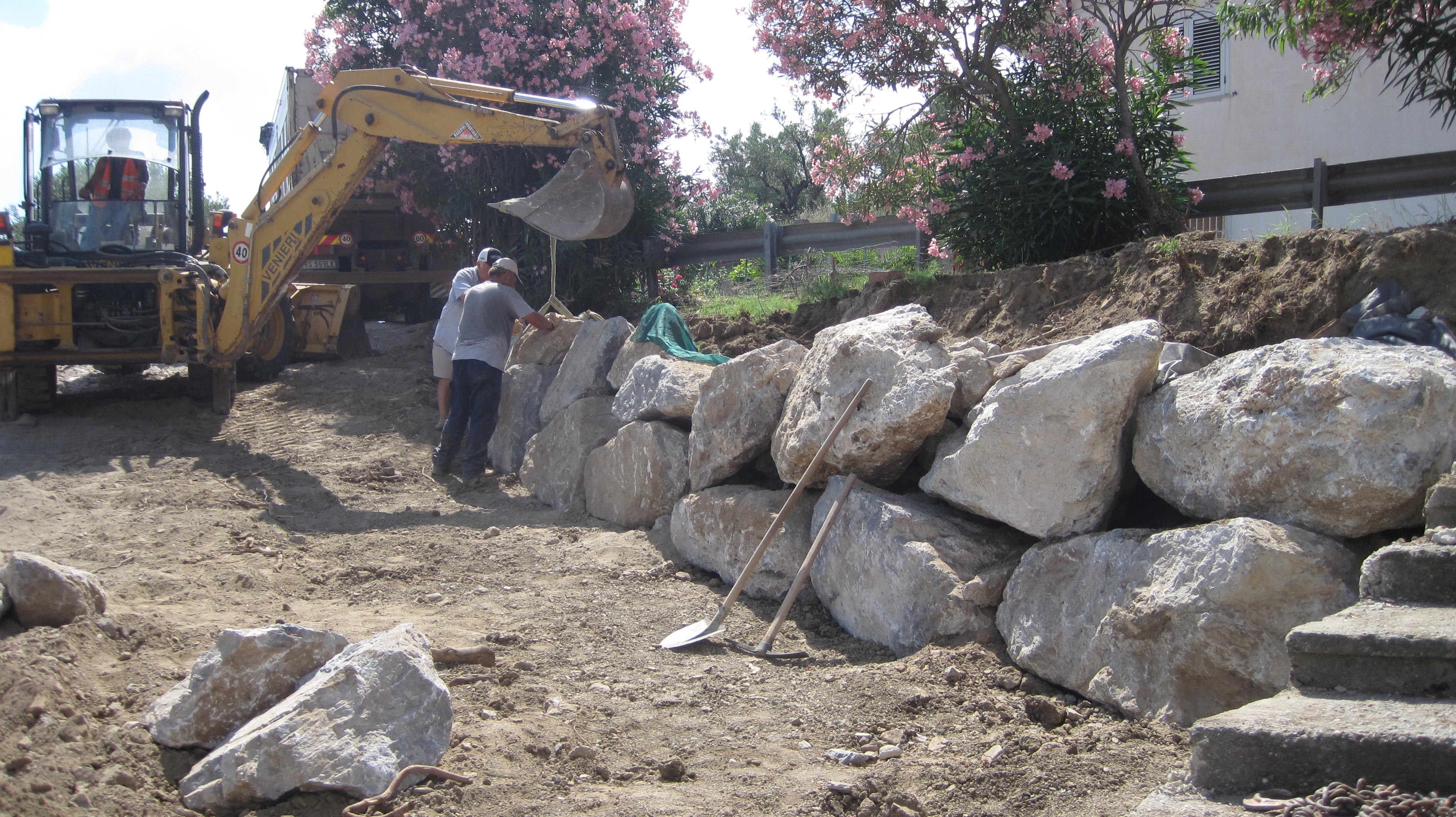 We decided to replace the wall with armour stones (at a few tonnes each) instead of bricks and cement because we love the rustic feel to it and we will eventually plant lavender and other herbs between the boulders, giving us both colour and fragrance.